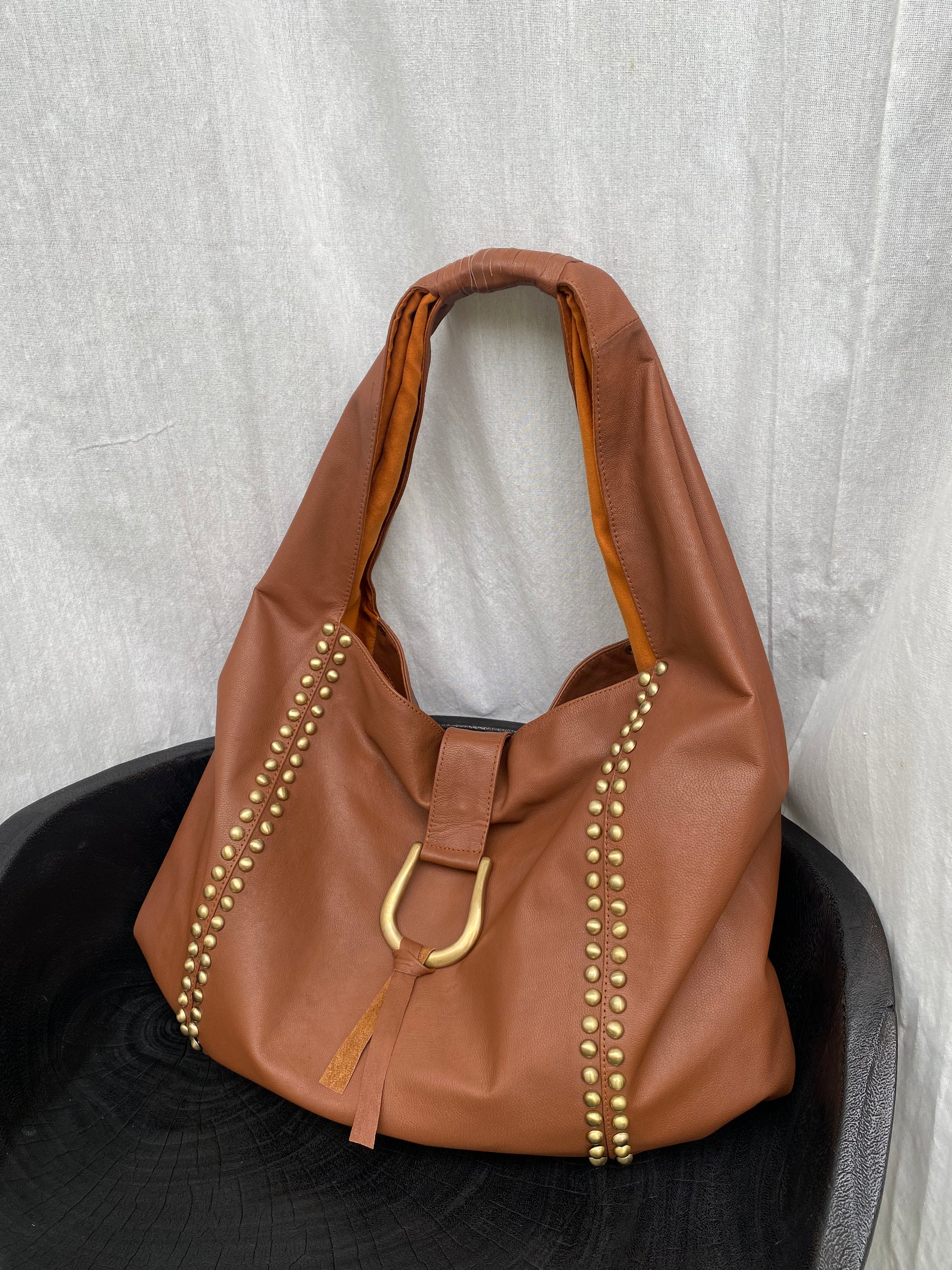 Crafted from soft lambskin, this bag exudes elegance with distinctive details. Antique-colored studs adorn the front and back, adding an iconic vintage touch. It features a practical magnetic buckle closure and an inner pocket for storing essentials. The interior is lined with soft faux suede, providing comfort and charm in one bag. Available in two colors and styles: Tobacco and Olive. The Barcelona Bag Olive exterior features suede in the center of the bag. The dimensions are the same for both bags.